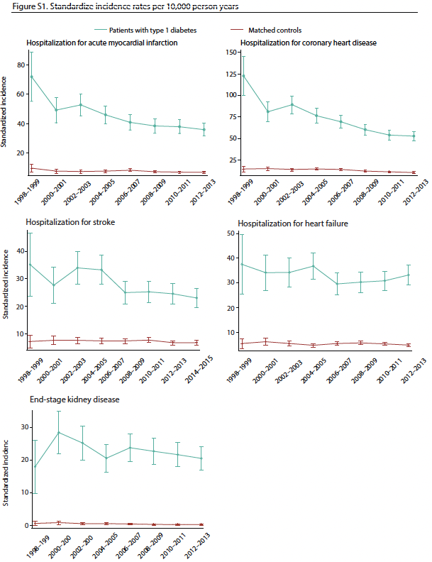 Studien nedan presenterar resultat för fatala händelser, dvs dödsfall relaterade till ischemisk hjärtsjukdom, stroke, hjärtinfarkt samt icke-fatal kardiovaskulär sjukdom. Studien visar att mellan 1998 till 2014 noteras en 40-60% minskning av hjärt-kärlsjukdomar bland individer med diabetes.
