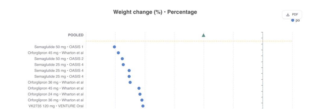 Figuren ovan illustrerar resultaten för orforglipron från en studie av Wharton et al., där man noterade en viktminskning på 13,5 % för 36 mg samt 14,7 % för 45 mg. Dessa siffror representerar maxdoseringen för läkemedlet.