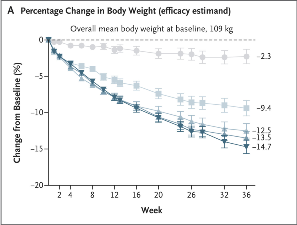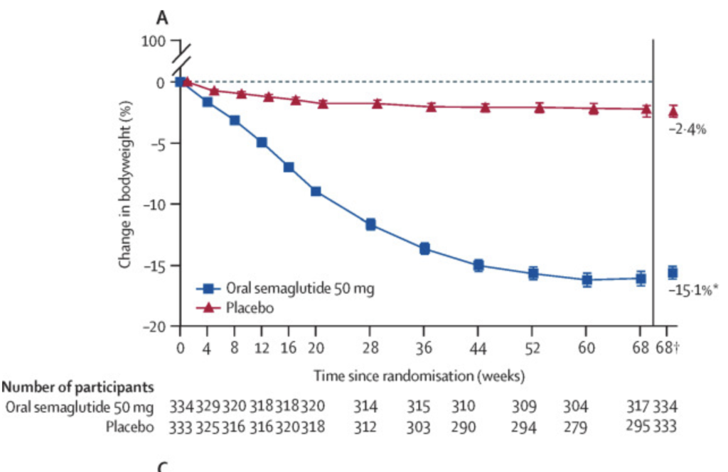 Figuren nedan är tagen från The Lancet (källa: 10.1016/S0140-6736(23)01185-6) där man kan se hur individer som fick Semaglutid 50 mg upplevde 15.1% viktminskning jämfört med placebo som endast gick ner 2.4%.